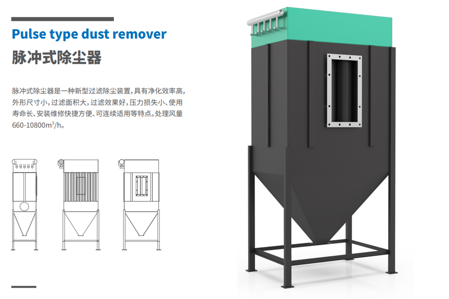 脈沖式除塵器由進風口、出風口,氣包、脈沖控制儀、噴吹閥、噴吹管組成,其下端封閉,上端中心正對噴吹 管下口,含塵氣體從進風口進入除塵器后,氣流的速度減慢,粗顆粒脫離氣流沉降到集塵室內,細微粉塵 隨氣流穿過時被阻于外表面,潔凈氣體由出風口排出;當表面灰層較厚時,脈沖控制儀發出指令開啟噴吹 閥,氣包內的壓縮空氣經噴吹管高速噴出,同時誘導數倍于噴射氣量的周圍空氣進入,并由內向外快速射 出,將外表面的粉塵吹下落入集塵室內,最后由放灰斗排出。除塵器清灰采用脈沖噴吹方式,既做到了徹 底清灰,又不傷害使用壽命。清灰過程由脈沖控制儀自動控制,可采用壓力差控制或時間控制。