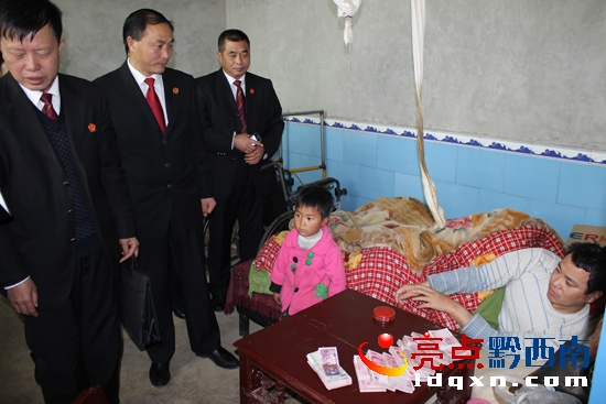2月27日下午,興義市人民法院黨組書記、院長楊再官帶領(lǐng)該院全體黨組成員及執(zhí)行干警一行10人專程趕到興義市魯屯鎮(zhèn)給癱瘓在床的當(dāng)事人張某送去了8萬余元救命錢。這是興義市法院深入開展群眾路線教育實踐活動,推進社會矛盾化解、社會管理創(chuàng)新,依法保護弱勢群體合法權(quán)益,進一步服務(wù)和保障民生,維護社會和諧穩(wěn)定的一個縮影。