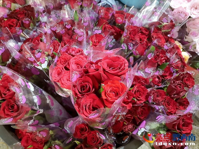 攤位上,店主正在忙著鮮花的搭配、包扎。玫瑰花也是五顏六色,紅的、黃的、白的、紫色的等等;供配置的花草有滿天星、相思豆、玫瑰花等。
