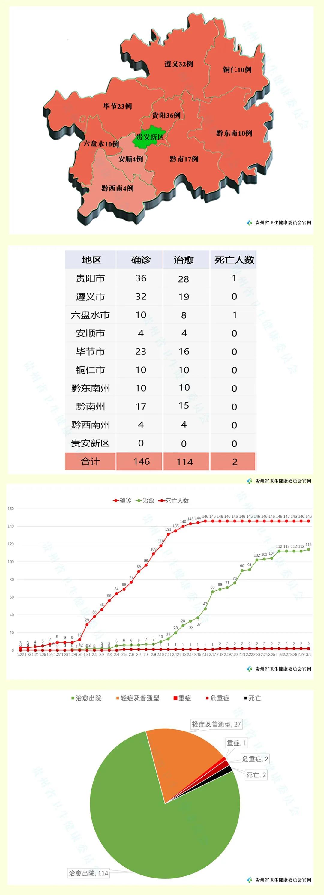 截至3月1日24時,全省累計報告新型冠狀病毒肺炎病例146例。其中,51例有武漢旅居史,14例有武漢外湖北其他地區旅居史,15例有湖北以外地區旅居史;治愈出院114例,在院治療30例(輕癥及普通型27例,重癥1例,危重癥2例),死亡2例;男性74例,女性72例;年齡最大87歲,最小1個月(確診時間);貴陽市36例(治愈28例,死亡1例),遵義市32例(治愈19例),六盤水市10例(治愈8例,死亡1例),安順市4例(治愈4例),畢節市23例(治愈16例),銅仁市10例(治愈10例),黔東南州10例(治愈10例),黔南州17例(治愈15例),黔西南州4例(治愈4例),F有疑似病例0例。