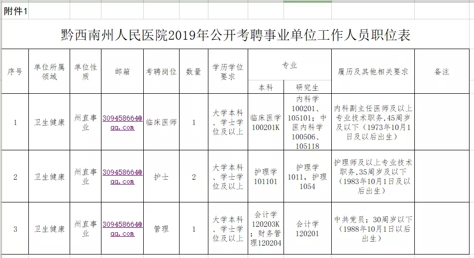 黔西南州人民醫院(財政定額撥款事業)醫療(或管理)專業技術崗位,共計4名。詳見《黔西南州人民醫院2019年公開考聘事業工作人員職位表》(附件1)。